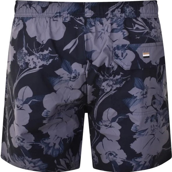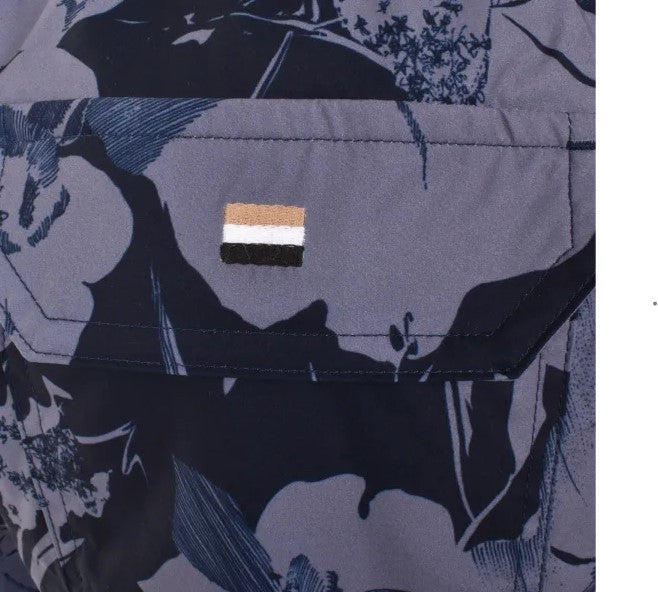 BOSS Beachwear Alain Swimshorts In Navy. An all over floral design with a elasticated waistband featuring a woven drawstring fastening. Two pouch pockets on the hips and a velcro fastening pocket on the reverse right. Woven tape details down the sides and the signature BOSS Three Stripe logo is embroidered on the reverse pocket. Black mesh pant lining with top stitching in navy.