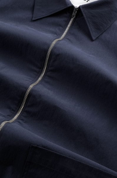 Zipper hybrid crafted in a tightly woven poplin from an organic cotton blend. Designed with a collar, and twin patch pockets at the waist. Finished with Mother-of-Pearl buttons on the cuffs.