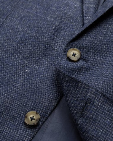 When the occasion calls for a polished layer, this men's Bluestone blazer is an ideal choice. Cut in a Sports Fit, it is crafted from a premium blend of 62% European Linen and 38% Australian Wool. This refined blend combines the natural breathability of European Flax with the soft texture of Australian Wool. The interior features a piano lining with meticulous colombia stitching,